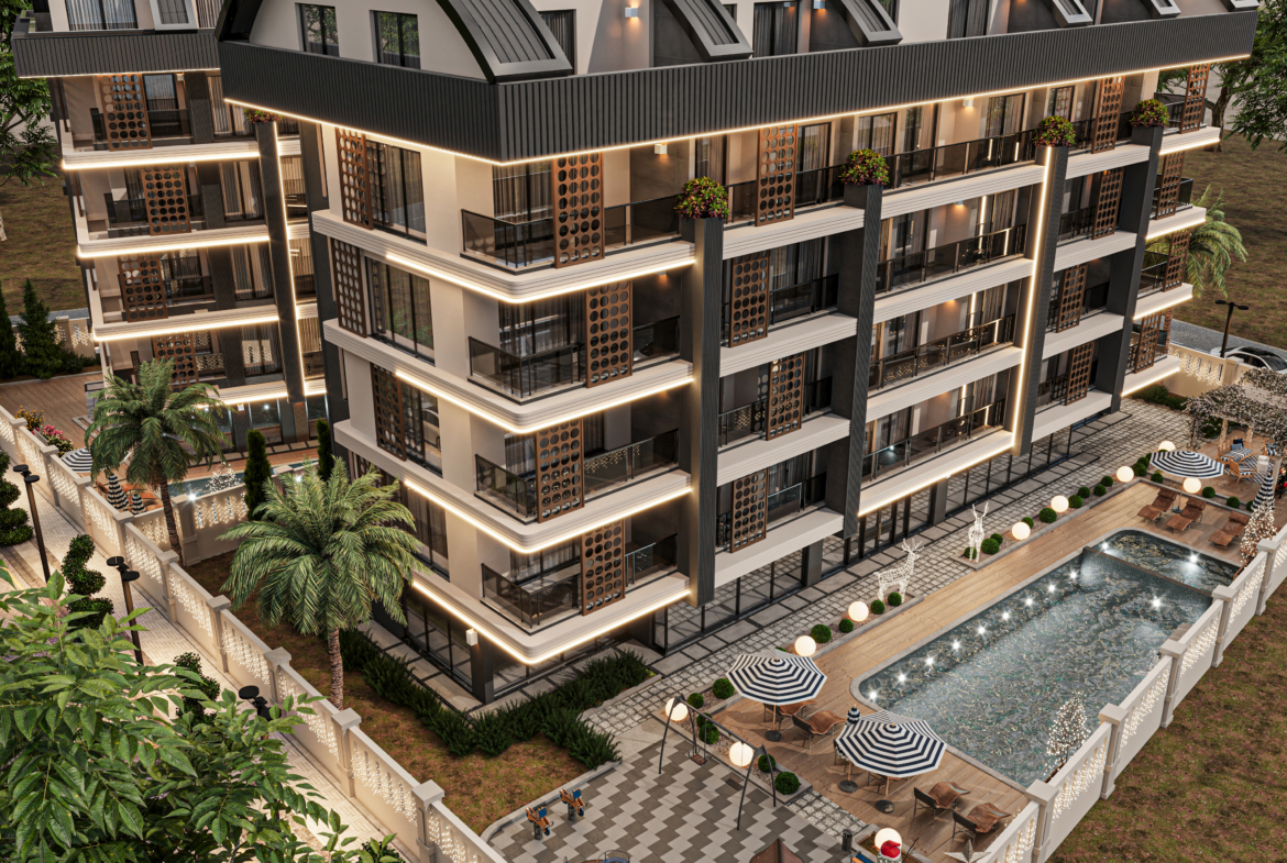 1+2 flat for sale in the new modern complex Apple Garden 1 in Oba location, 2 km from Alanya center. This rapidly developing region is very popular among tourists and investors as it has everything you need for a comfortable life. A new luxury residential complex with its own infrastructure, located in a popular holiday resort, 1 km from the center of Alanya. All the necessary urban infrastructure is located nearby: cafes, restaurants, bars, shops, shopping malls, hospitals, pharmacies, parks, banks and public transport stops. Modern design solutions, unique location, breathtaking views, sea blue, magnificence and splendor. Apple Garden 1 is a 4-storey building with modern architecture. The complex’s rich infrastructure and friendly staff will help you fully enjoy life.