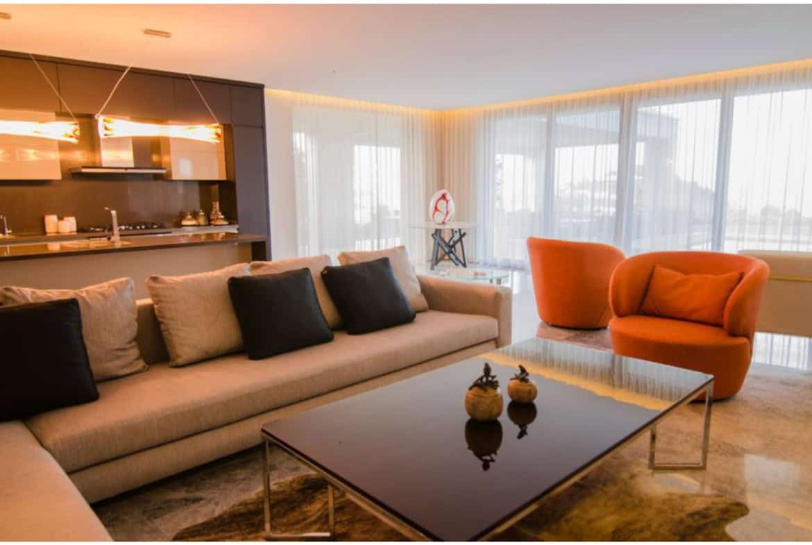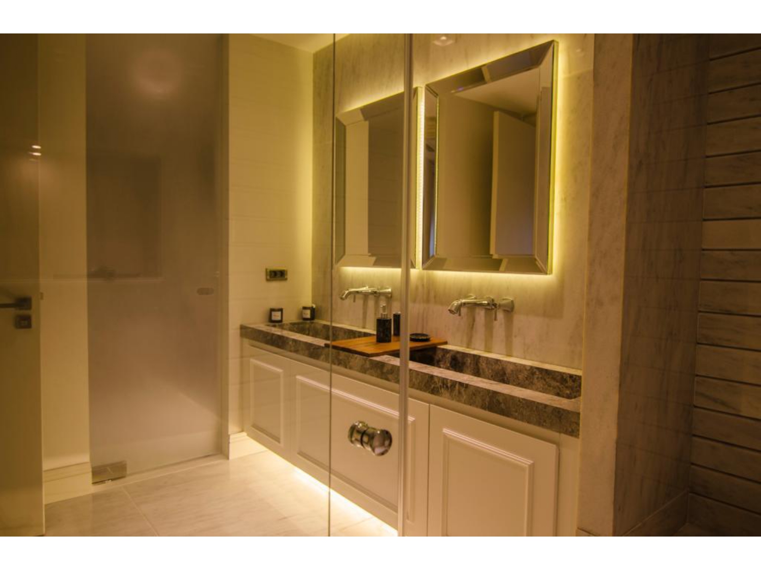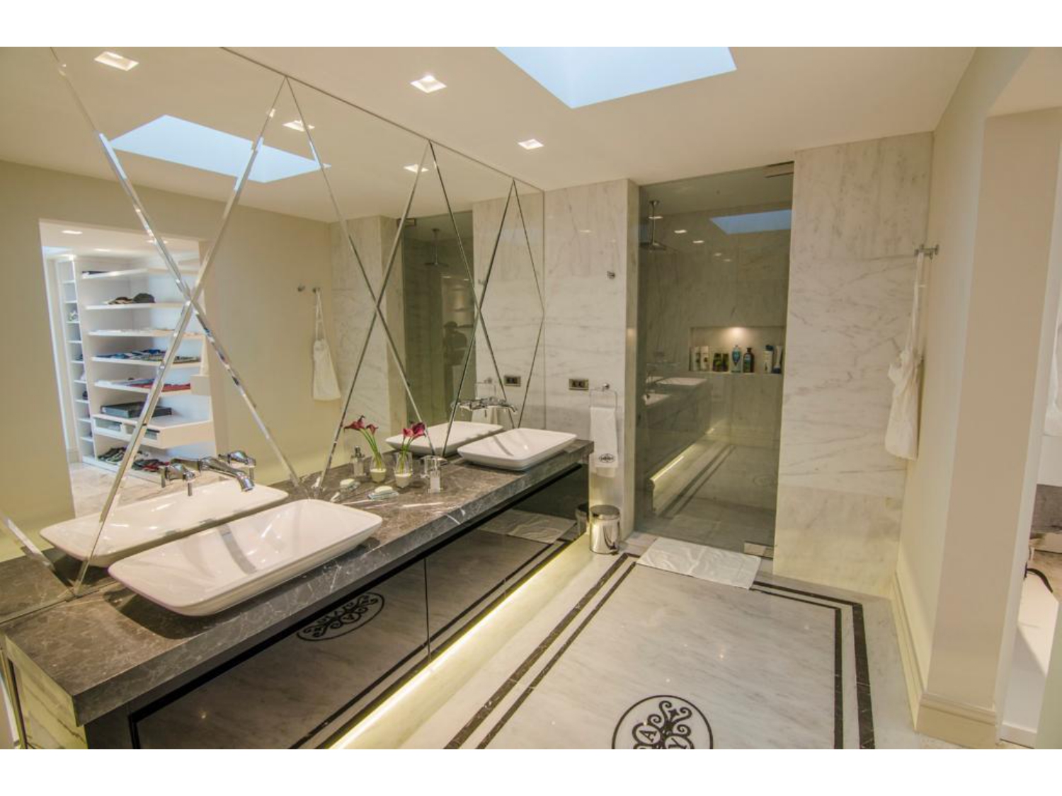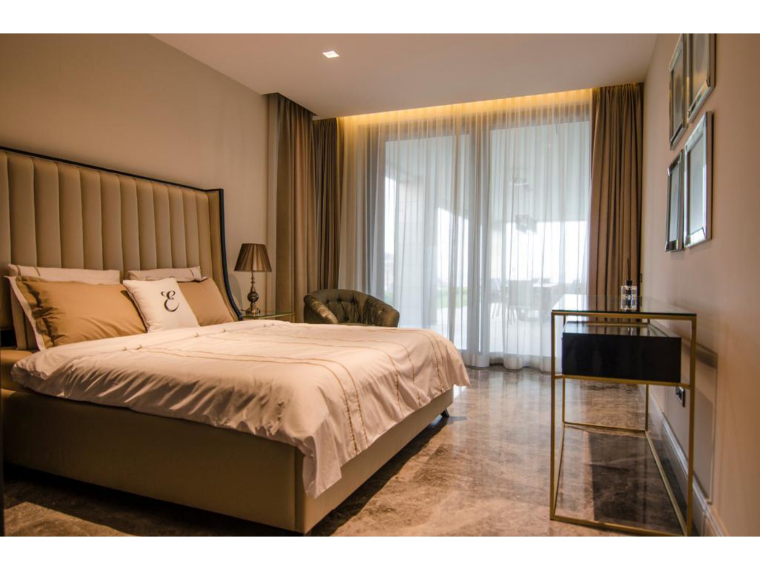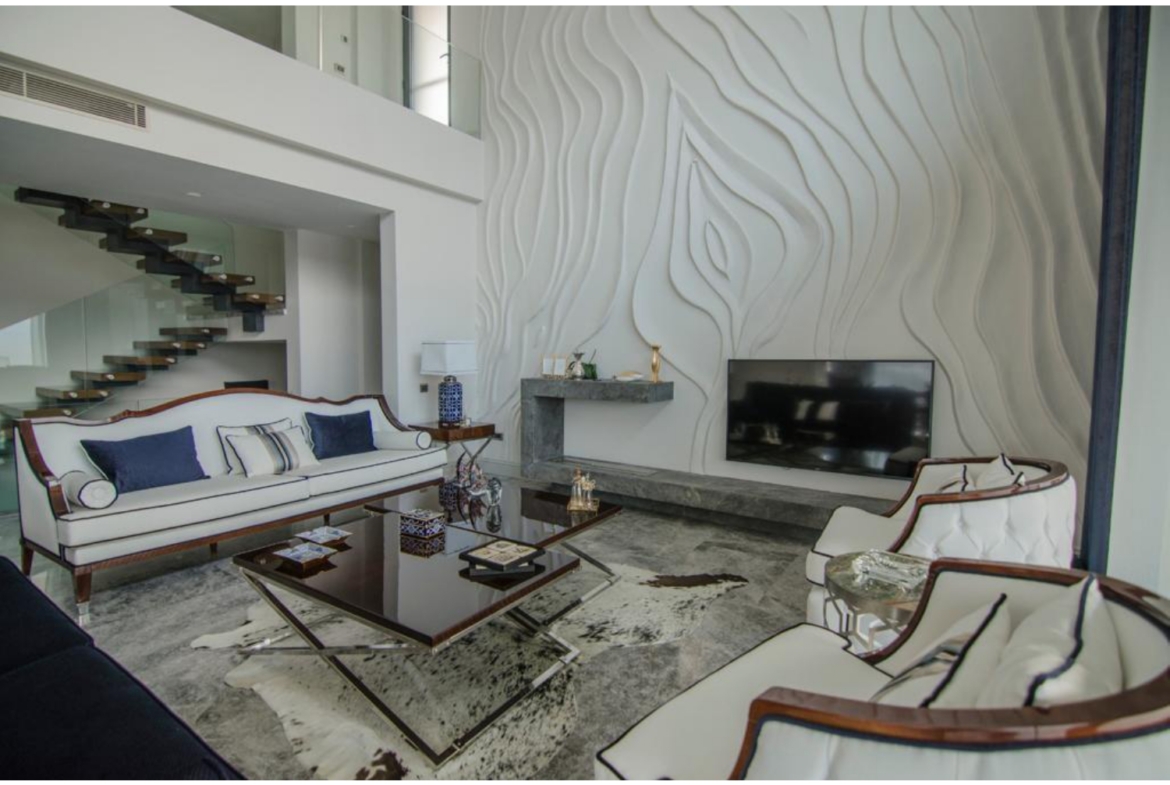 On the upper floor, there is a luxurious master bedroom suite with a private terrace. On the lower floor, there are 2 large double bedrooms with direct access to the garden, pool area, dressing rooms and a premium living space. This floor also includes a kitchen, living room, TV area and Maid’s room.